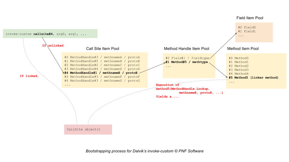 - If not, a new CallSite object is created using the data provided by the call site item at the corresponding pool index, via a bootstrap linker method