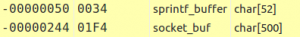 The vulnerability comes from the small size of the sprintf() buffer, which is only 52 bytes long, as you can see here in JEB stackframe view: