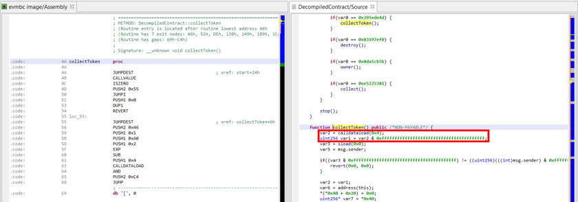 Below, see the public method collectToken(), which is retrieving its first parameter – a 20 byte address – from the calldata.